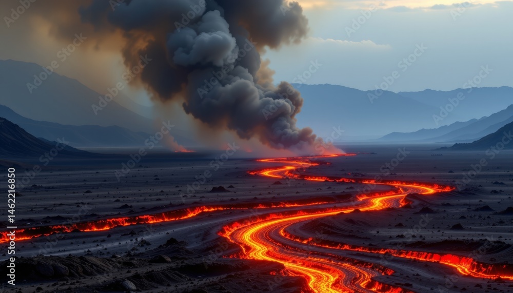 Samolepka thick, viscous streams of glowing magma flow across the surface, leaving behind a trail of scorched earth and billowing black smoke, evoking visions of a fiery apocalypse in a hellish landscape