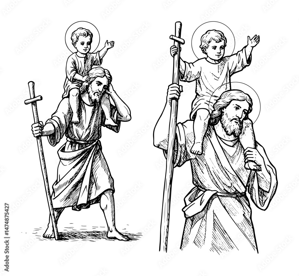 Samolepka saint christopher carrying child jesus hand drawn illustration