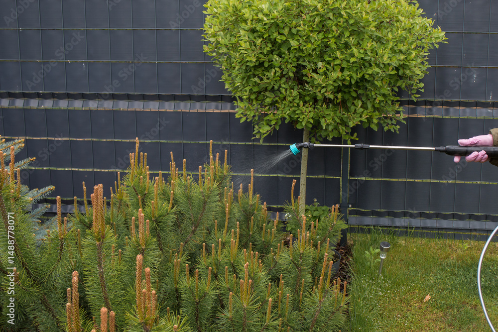 Samolepka A gloved hand holds a spray bottle and sprays water on decorative conifers and a small tree in the garden