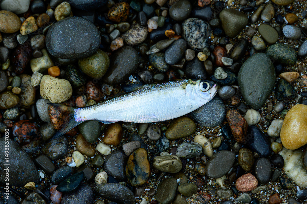 Samolepka Alewife (Alosa pseudoharengus ) washed up dead on the shore of Lake Ontario in spring