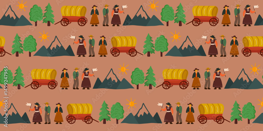 Samolepka pioneer day seamless pattern with covered wagons, settlers, mountains, and trees