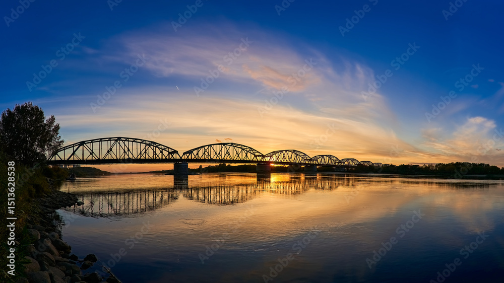 Samolepka A large panoramic shot of the bridge over the river against the sunset background