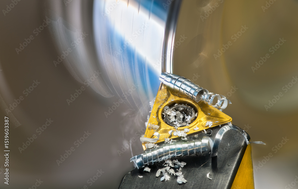 Samolepka Closeup of lathe tool bit with metal shavings curled up spiral at turning rotating workpiece