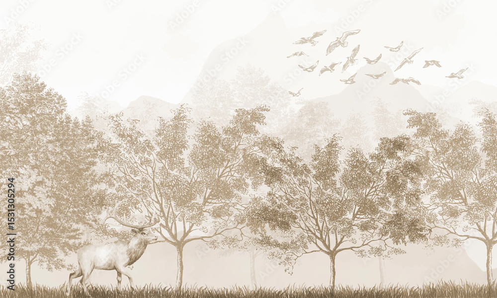Samolepka Vintage Forest Animals Wallpaper: Deer in Muted Brown Woodland Landscape Scene