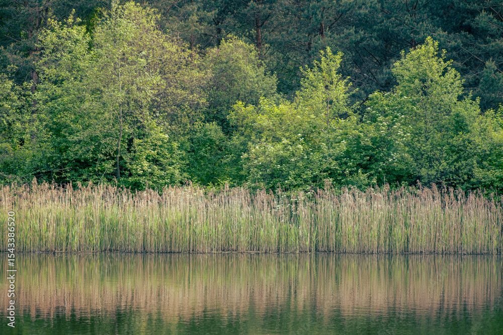 Samolepka small calm lake with deciduous forest and reeds on the shore
