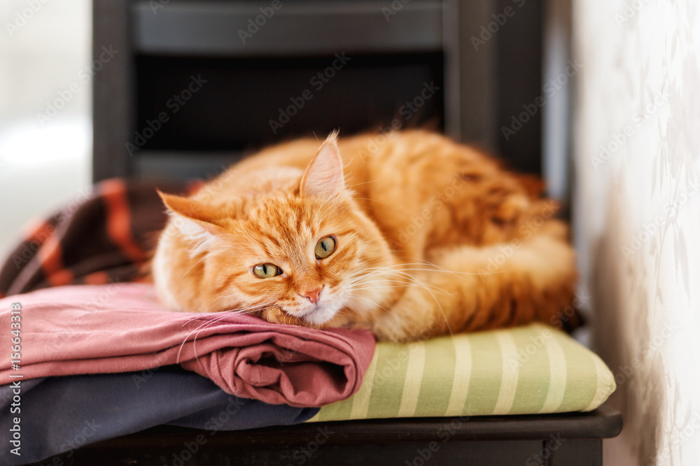 Samolepka Cute ginger cat sleeps on a pile of clothes