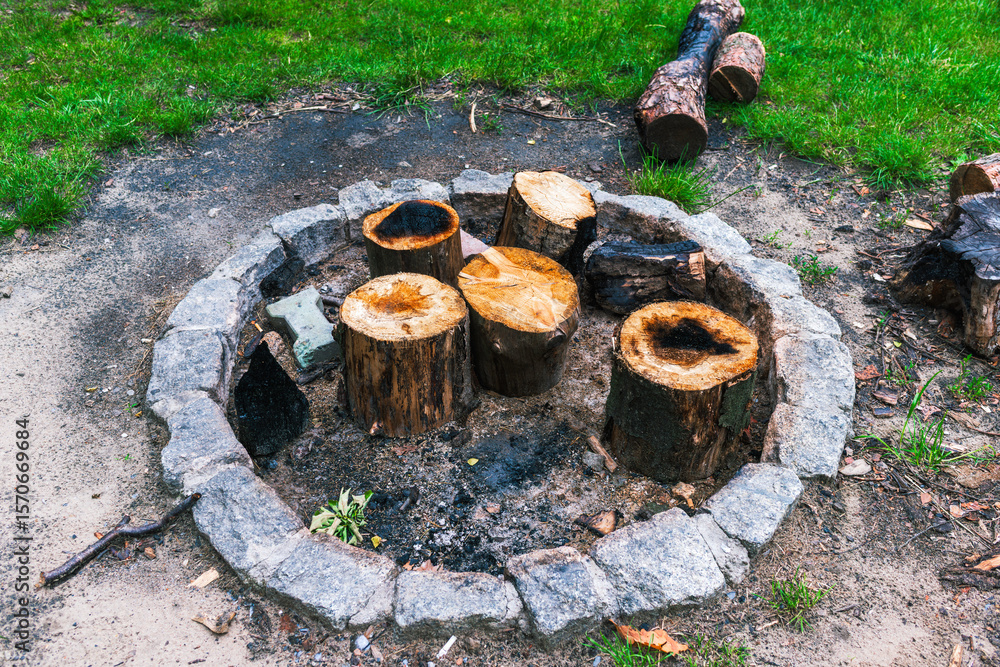 Samolepka Rustic round stone fire pit surrounded by freshly cut tree logs and firewood on a grassy campground