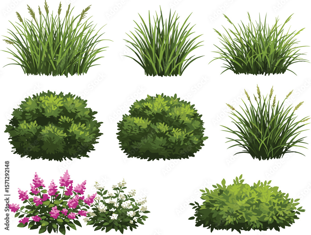 Samolepka Realistic garden shrubs and grass plants collection, flowering bushes, landscapi