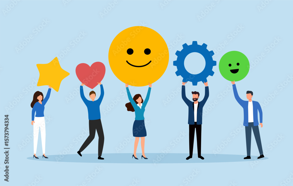 Samolepka Employee satisfaction, workplace happiness or success team motivation, employee engagement or participation, feedback or company survey rating concept, business people employee with smile happy face