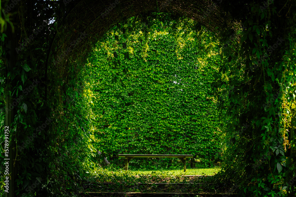 Samolepka A secluded bench sits under a leafy green archway, surrounded by dense foliage and a vibrant wall of ivy, creating a peaceful garden hideaway