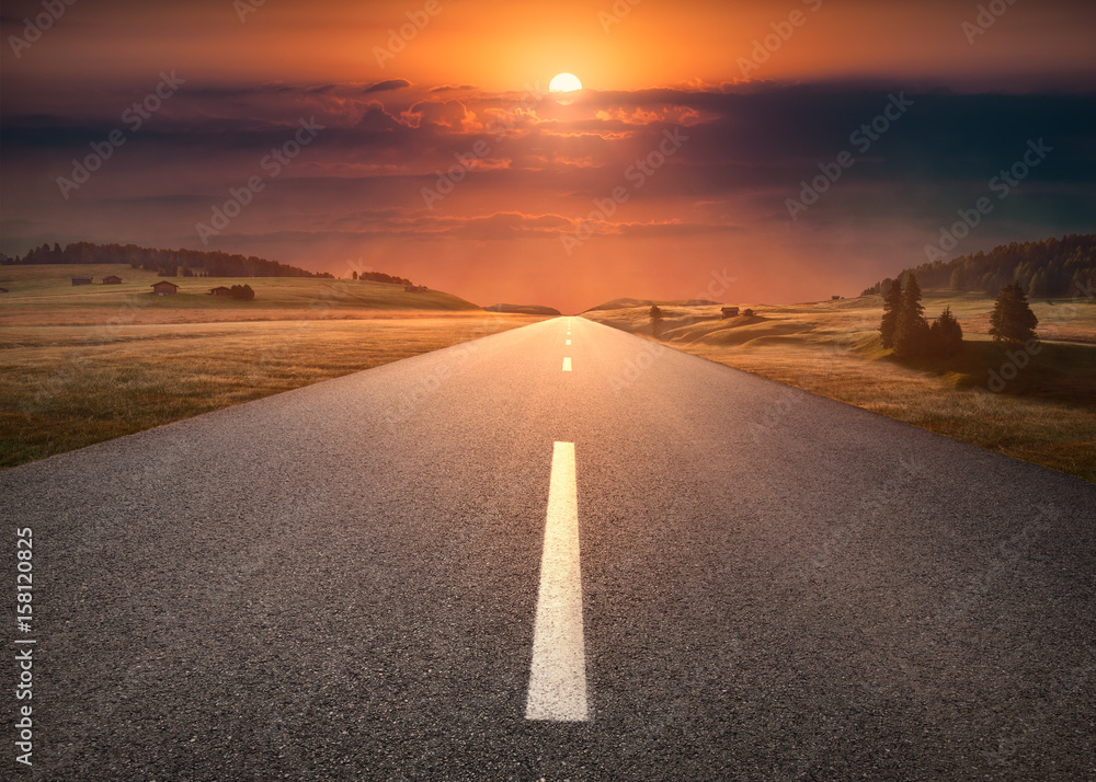 Samolepka Empty road through mountain scenery at idyllic sunset