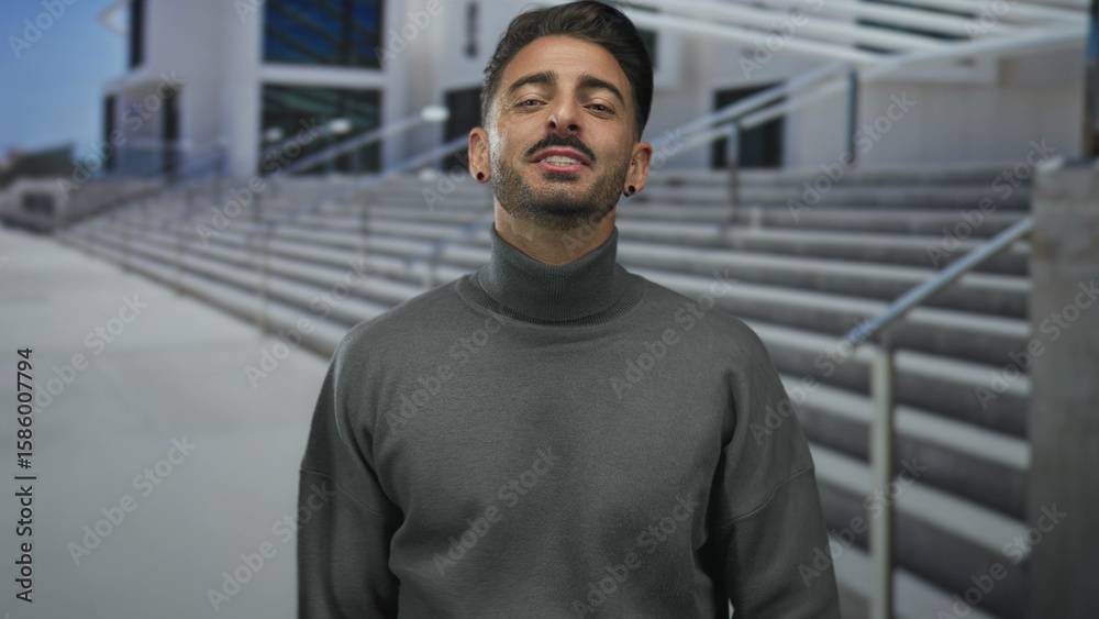 Samolepka Smiling young hispanic man wearing grey turtleneck pointing finger at building facade outdoors; confidence exuberance optimism joy