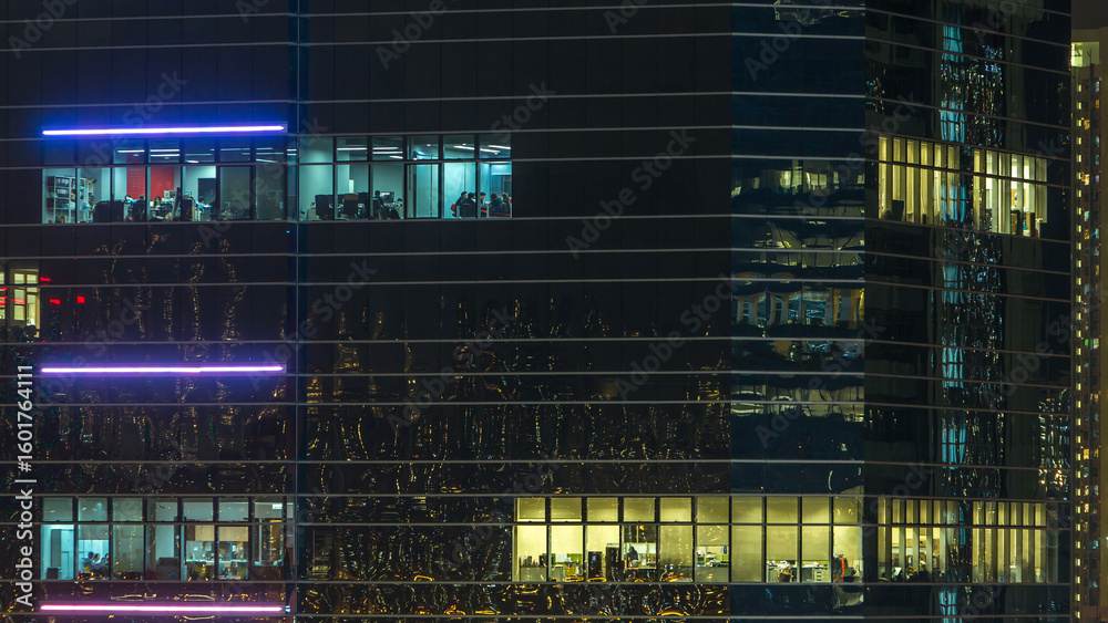Samolepka Windows in modern city office building at night timelapse.