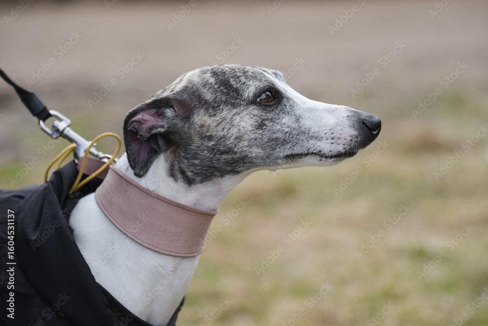 Samolepka whippet, small grey brittish sighthound dog in dog clothes, close-up profile por