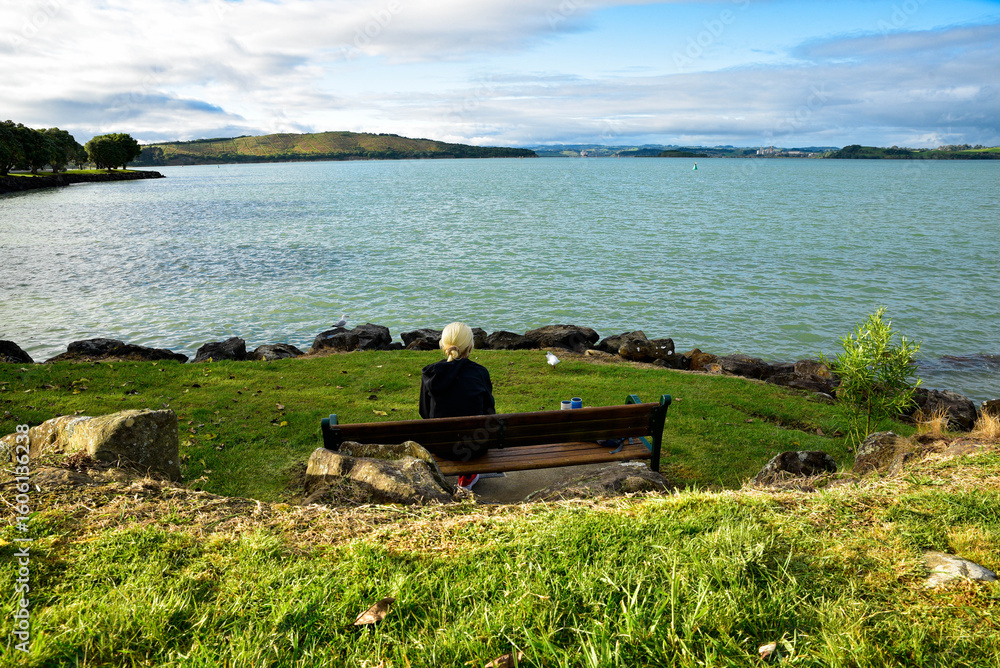 Samolepka A blonde woman wearing a jacket is enjoying the natural beauty around Whangarei Warf, New Zealand