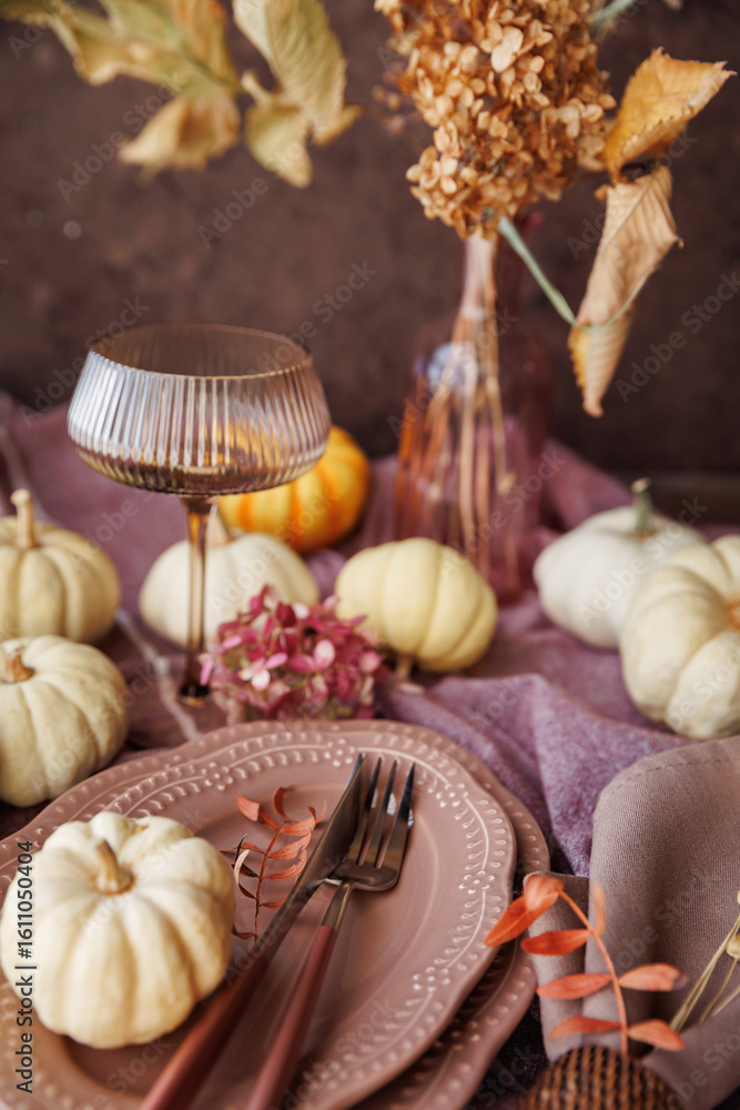 Samolepka A warm autumn tablescape with white pumpkins, stylish dinnerware, dried florals,