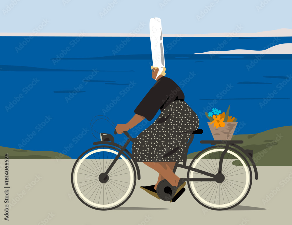 Samolepka A Breton woman, dressed in traditional clothing from the Brittany region of northwestern France, is riding a bicycle through a charming rural landscape