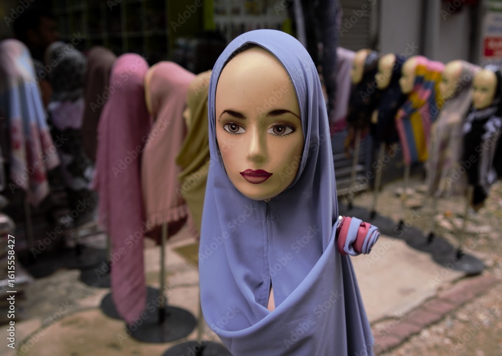 Samolepka Tudong shop with mannequins wearing them in the oldtown of Kuala Lumpur, Malaysi