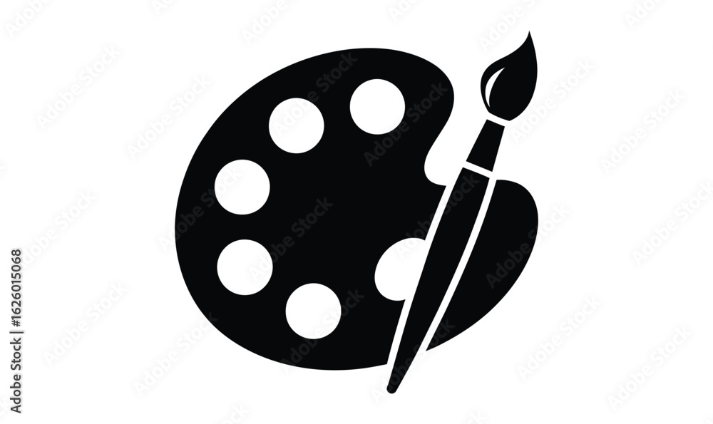 Samolepka black silhouette icon of artist's paint palette and brush with circular wells, m