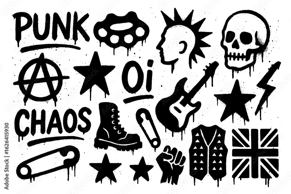 Samolepka Punk subculture icons with mohawk, skull, anarchy symbol, and guitar in graffiti