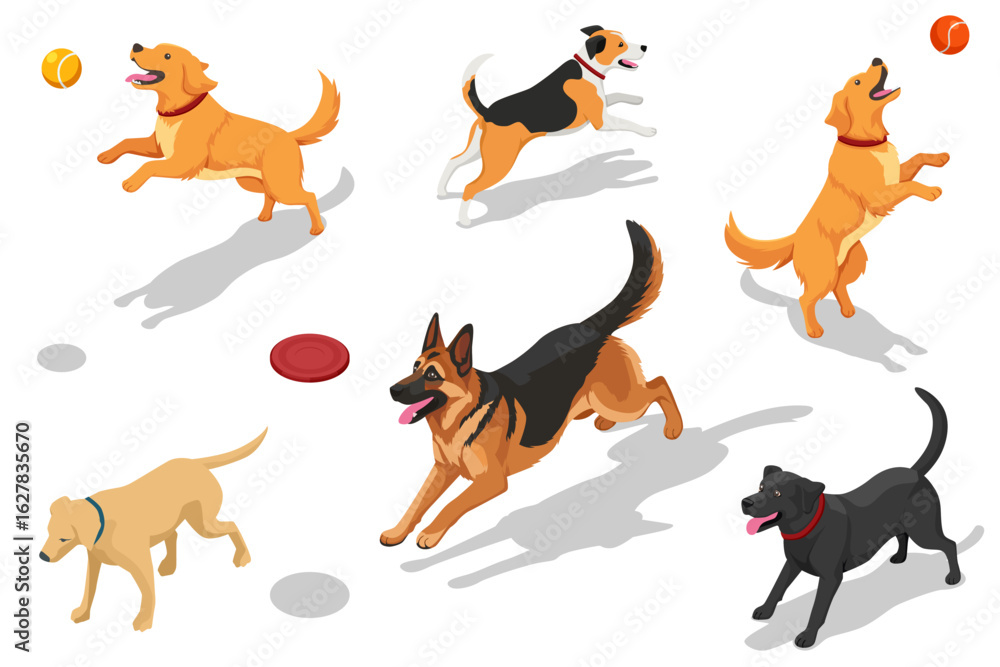 Samolepka Isometric illustration of different dogs playing with ball and frisbee