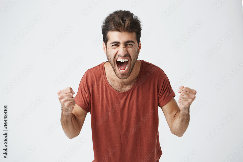 Samolepka Happy positive excited young man clenching fists and screaming, wearing casual t-shirt glad to hear good news, celebrating his victory or success