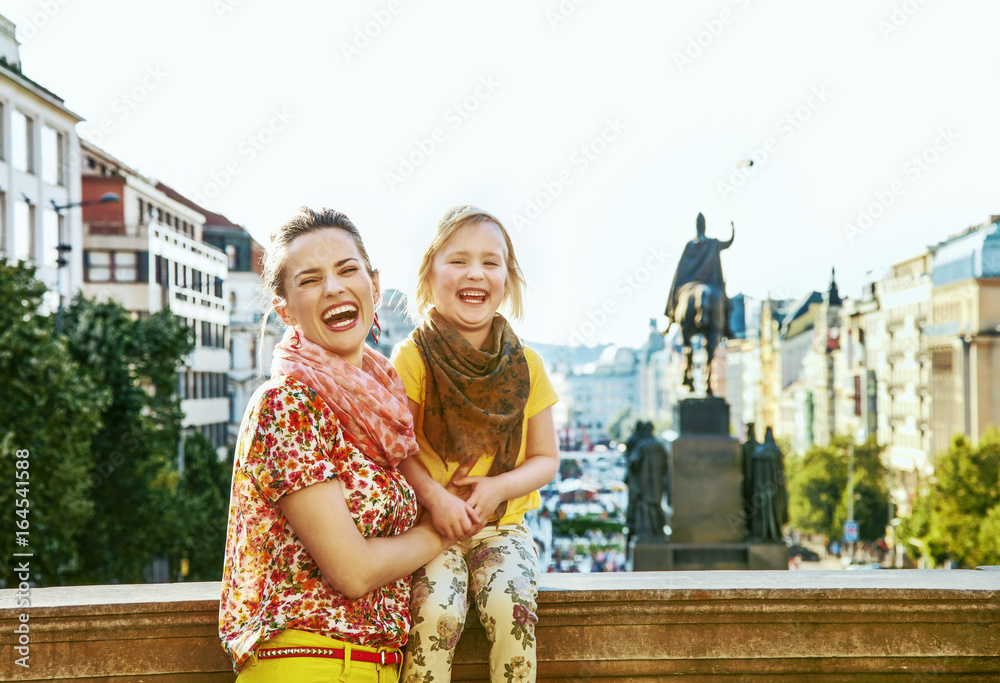 Samolepka happy mother and daughter tourists in Prague Czech Republic