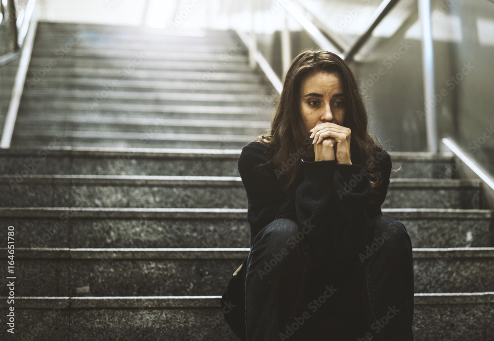 Samolepka Adult Woman Sitting Look Worried on The Stairway