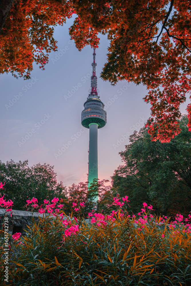 Samolepka Stunning View of Namsan Seoul Tower Framed by Autumn Foliage and Vibrant Pink Flowers at Sunset in Namsan Park, South Korea – A Breathtaking Blend of Nature and Iconic Architecture