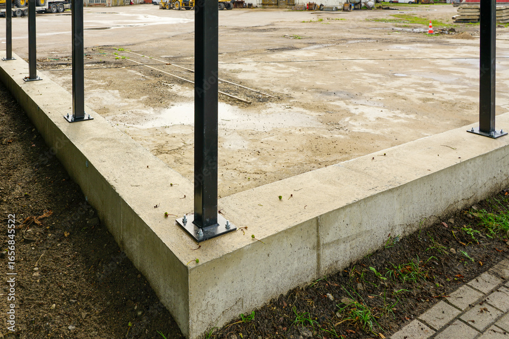 Samolepka New fence construction with concrete foundation and anchored black metal posts a