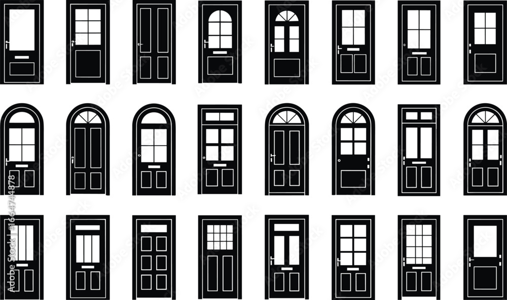 Samolepka Classic black door vector collection, vintage and modern front door silhouettes,