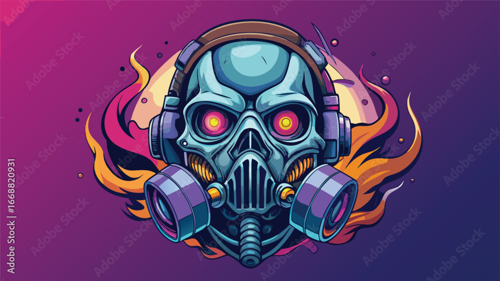 Samolepka A human skull wearing a gas mask, symbolizing themes of danger and protection in a post-apocalyptic context