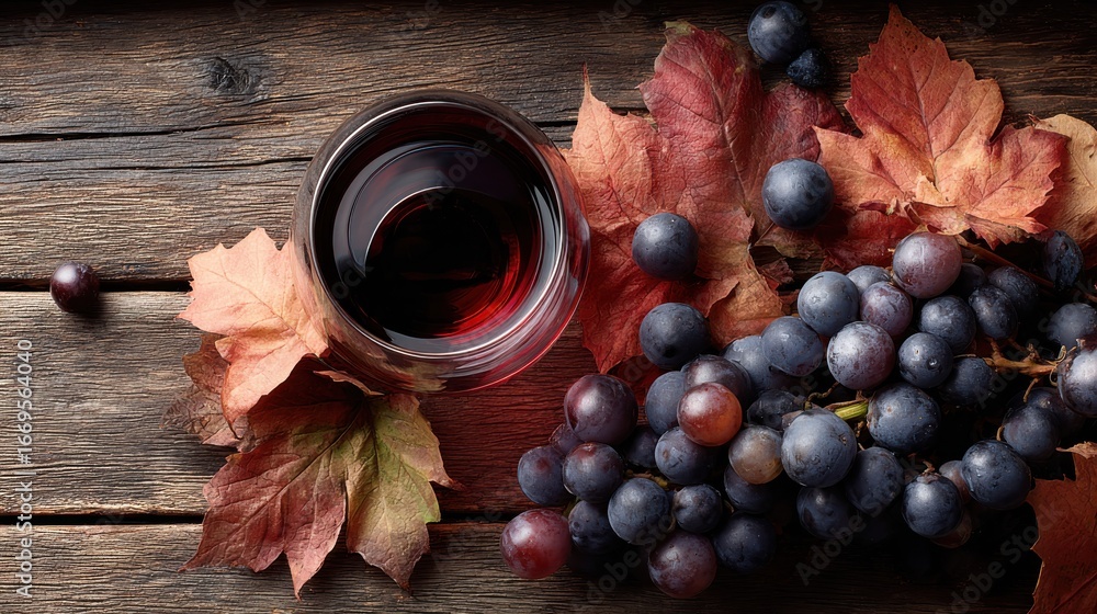 Samolepka A beautifully composed image of red wine alongside fresh grapes and autumn leaves capturing sophisticated indulgence