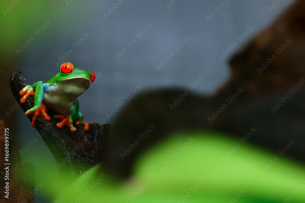 Samolepka Colorful amazon Red-eyed tree frog clutching on green leaves with blurred foreground from green bokeh