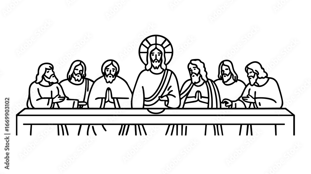 Samolepka Minimal black and white vector illustration of the Last Supper, depicting Jesus Christ with his twelve disciples at the table