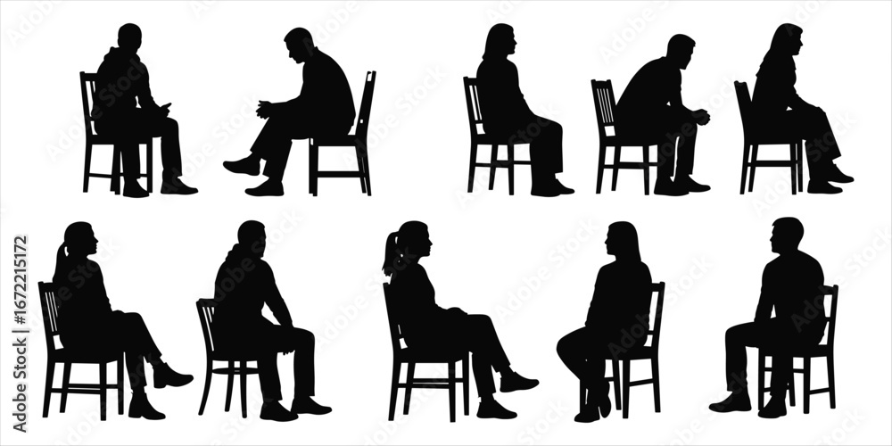 Samolepka Group of seated people silhouettes in various poses on white background sitting