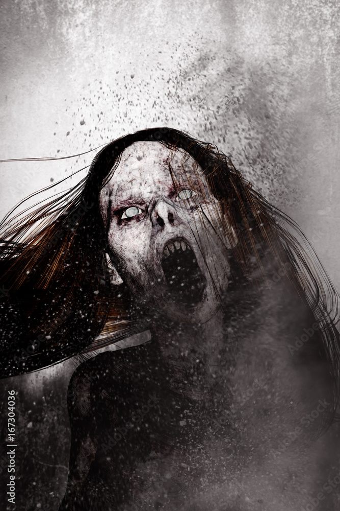 Samolepka 3d illustration of close up scary ghost woman,Horror background mixed media