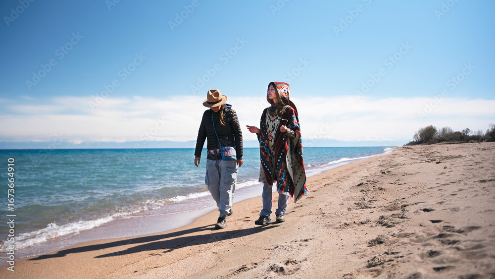 Samolepka A lesbian couple in love is strolling along the beach