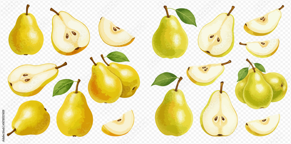 Samolepka A collection of ripe yellow and green pears, shown whole, halved, and sliced on a transparent background
