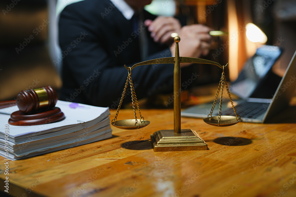 Samolepka judge on wooden table And experienced lawyers meet with clients and give advice behind the scenes