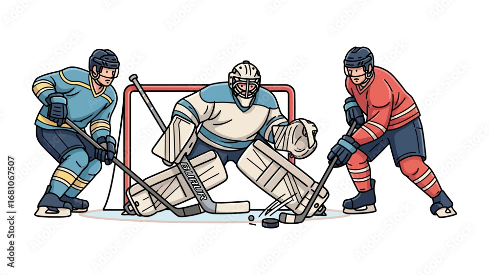 Samolepka Hockey Game in Action: Two players and a goalie in a graphic action scene