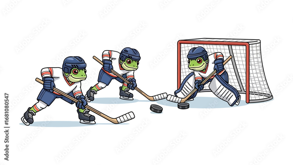 Samolepka Frog Hockey Showdown: A dynamic illustration of cartoon frog characters passionately engaged in a hockey match, complete with puck, goal, and spirited competition