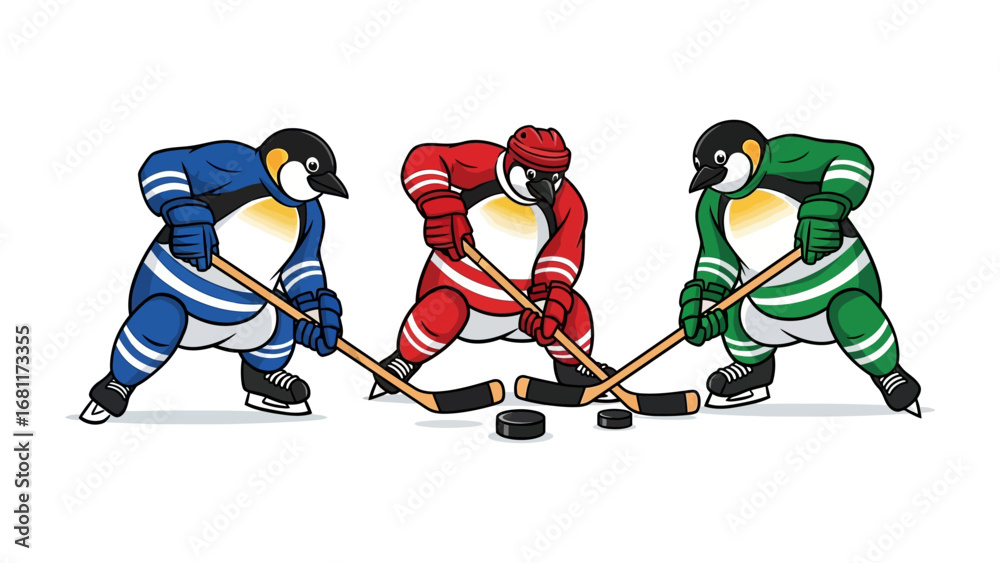 Samolepka Penguin Hockey Showdown: Three spirited penguins engage in an animated hockey game, their vibrant uniforms adding a touch of fun to the exciting sports scene