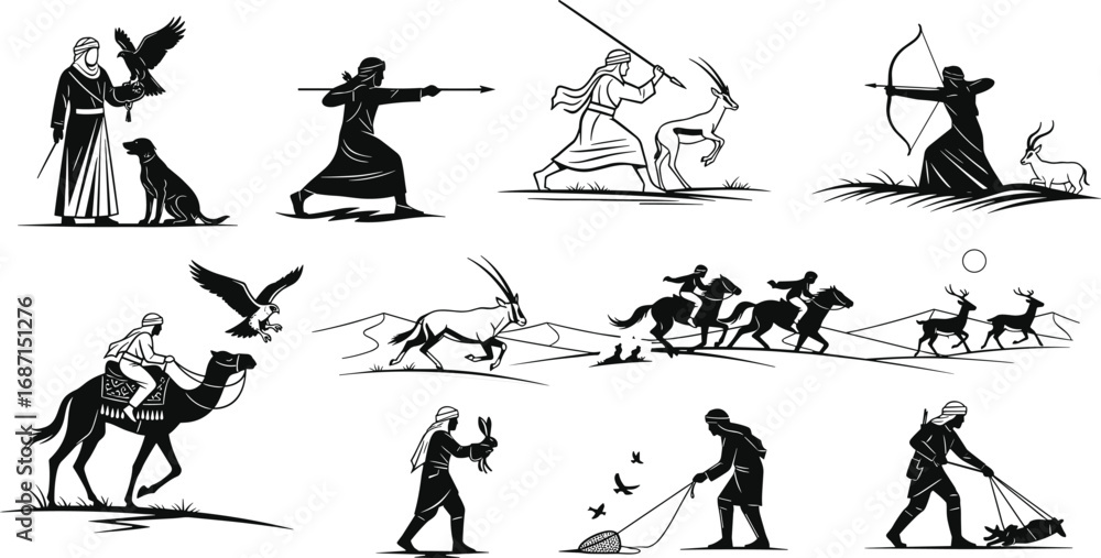 Samolepka Traditional hunting, desert hunters, falconry, archery, animal tracking, spear h