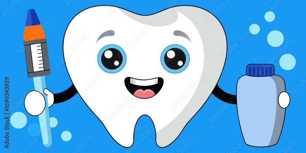 Samolepka Create a realistic image of a healthy human tooth standing upright, holding a toothbrush in one hand and a tube of toothpaste in the other