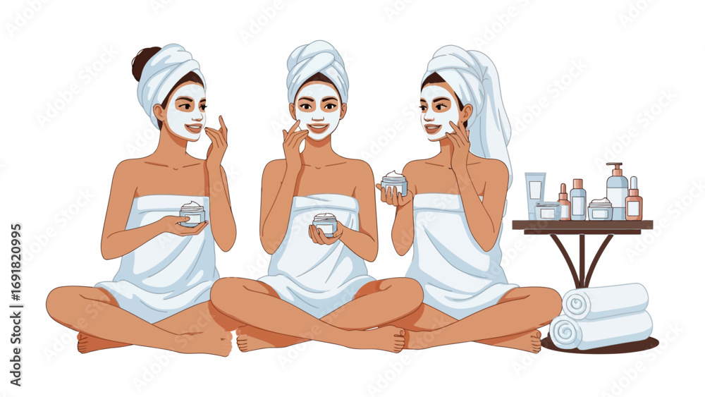 Samolepka Three young women with towels wrapped around their heads and bodies applying fac