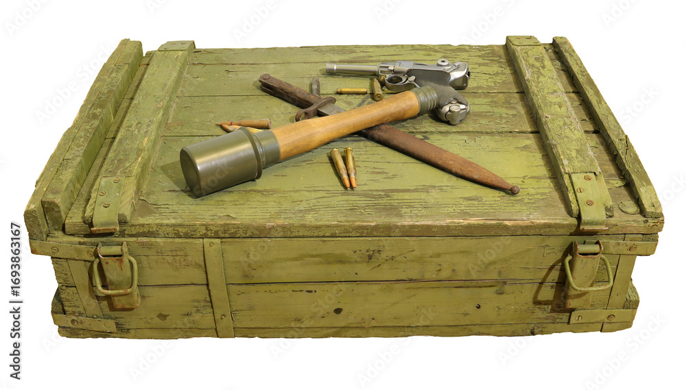 Samolepka green military crate with ammo , hand grenade ,old rusty bayonet and pistol on t