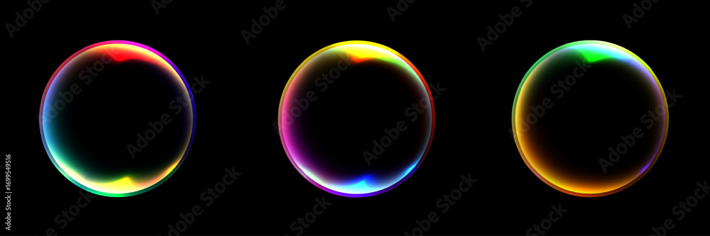 Samolepka abstract glowing spheres with iridescent rainbow halos on dark background lumino
