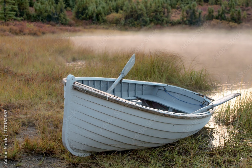Samolepka White rowboat on bank of lake on a misty morning
