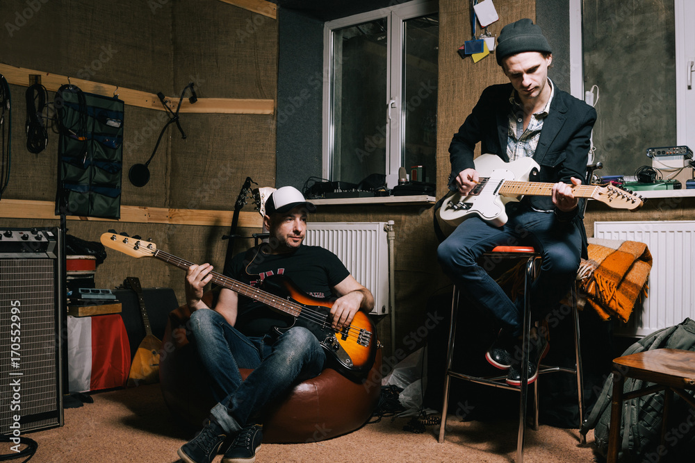 Samolepka Band of adult guitarists rehearsing in studio